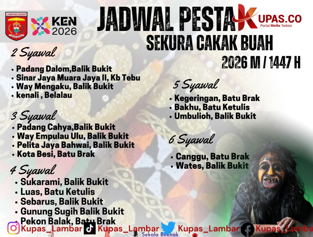 Kupasmedia.co – Pemerintah Kabupaten Lampung Barat mulai mematangkan persiapan pelaksanaan pesta budaya Sekura Cakak Buah yang akan digelar bertepatan dengan momentum Hari Raya Idulfitri 1447 Hijriah. Sejumlah pekon telah lebih dahulu menetapkan jadwal pelaksanaan tradisi tahunan tersebut yang akan dimulai pada 1 Syawal mendatang.